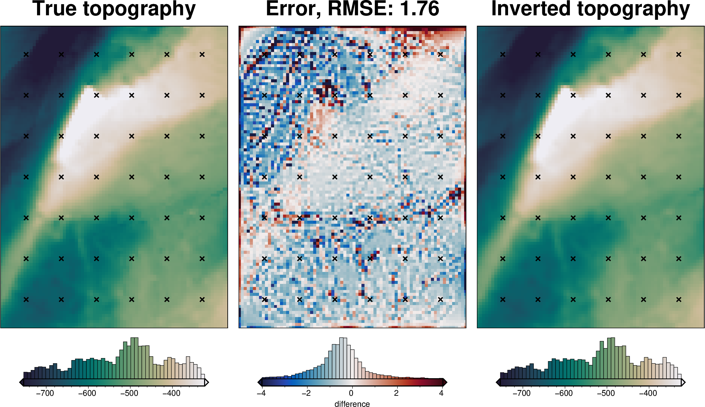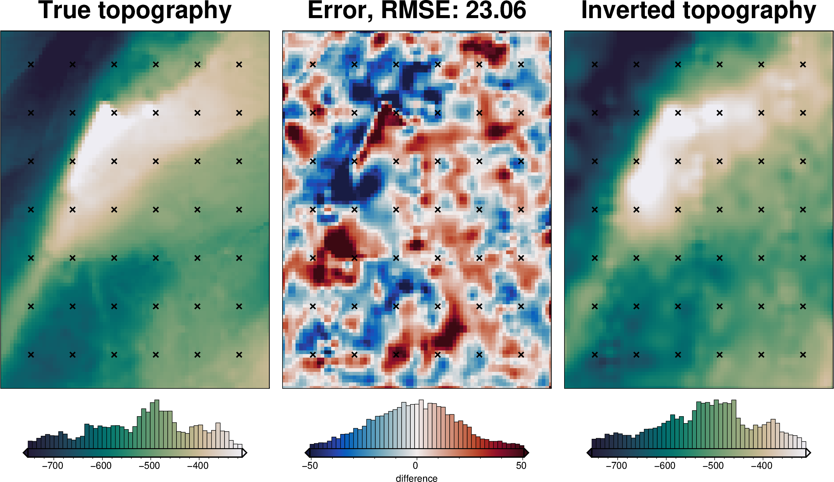 This is the simplest test, where the observed gravity is the direct forward calculation of the true bathymetry model.