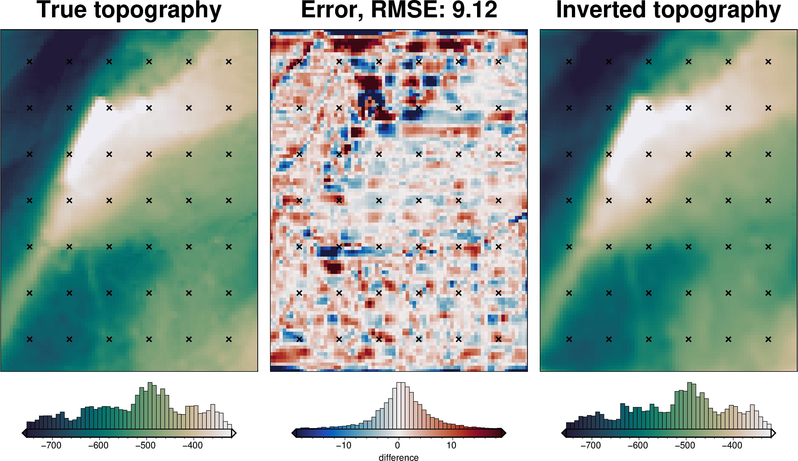 This test combines all the complexities of Test 1-4 to be a semi-realistic (while still synthetic) bathymetry inversion.