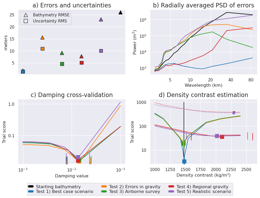 Each of these tests first estimates the optimal regularization damping parameter values, which controls the smoothness of the results, using a optimized cross-validation routine (A in below figure). Next, each of these tests estimates the optimal seafloor density contrast with another optimized cross-validation procedure (B in below figure).